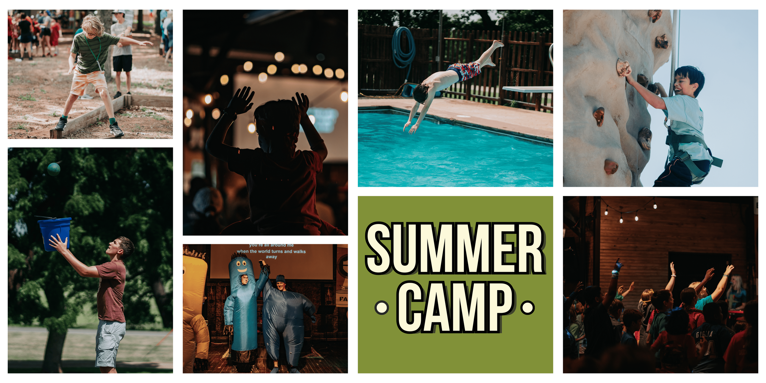 NIGHT ACTIVITIES: After chapel and snacks each night, the fun keeps going with evening activities! Campers will have the option to participate in activities like laser tag, a pool party, open mic, team games, and a campfire.